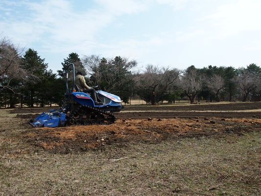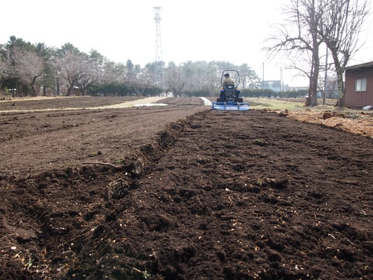 2月に作った木チップとしいたけの廃菌床を畑に散布し、トラクターで耕起しています。土の中や廃菌床にいる糸状菌にエサといっしょに土の中に入ってもらい、土づくりをしてもらいます。どうかいい土ができますように。