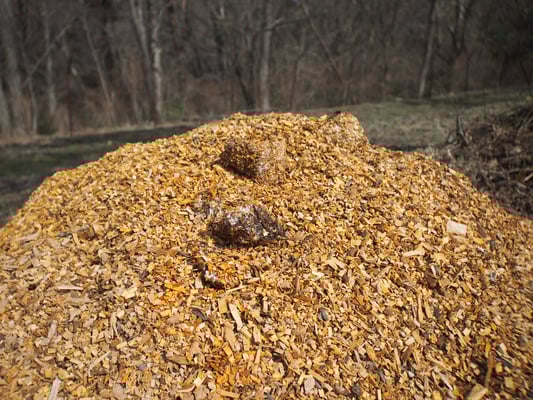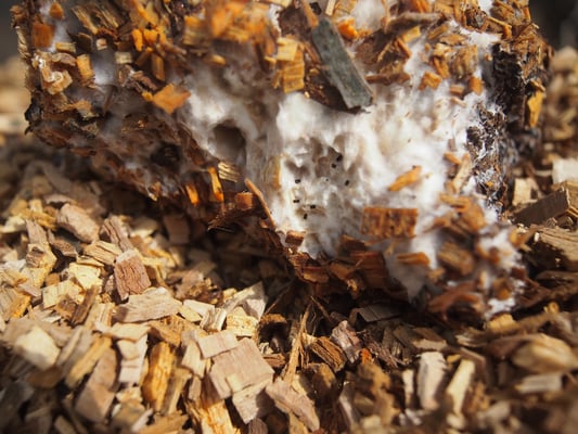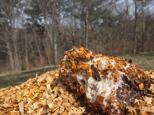 ちなみに、チップづくりをしたとき、一部を畑の片隅に山盛りにしておき、そのなかに廃菌床を入れておきました。2週間ほどたって山の中の廃菌床を取り出してみたら!白い糸状菌がたくさん増えていました!糸状菌は切ったばかりの生木・生草が大好きだそうで、それでも短い間でこんなに増えているなんて驚きました。畑でも力を発揮してくれるはずです!