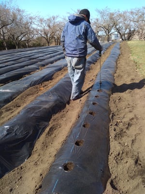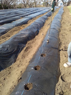 もちろん畑の準備もどんどんしています。ビニールハウス、畝立て、あとはマルチをはったり。写真はじゃがいも用の畝にマルチ穴あけバーナーで植え付け穴をあけているところです。