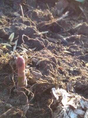 そして、野菜たちも暖かさのおかげでどんどん成長しているようです。去年の春に植えたアスパラガス、晩秋に刈り取りをして冬の休眠に入ってもらいましたが、一昨日に新しい芽が出ていました!心配していましたがホッとしました。去年より太いアスパラガス、これからどんどん成長してほしい!でもまだ株成長の時期なので、今年も収穫せずに見守りです。