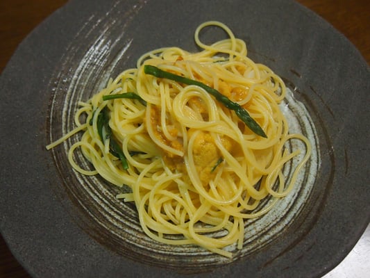 アスパラガスは旬を迎えて収穫も最盛期。毎日すくすく伸びています。そして同じくこれから旬を迎えるもの、それは生ウニです!おいしいですよね。パスタでアスパラとともに生ウニを堪能!ウニを使ったパスタはクリーム系が多いと思いますが、今回はウニをぜいたくに使ったパスタで、パスタの仕上がりのところで生ウニを投入し、熱々パスタの熱でウニが程よくとろけてなめらかになったところでお皿に盛り付け、いただきます!最高ですよ。