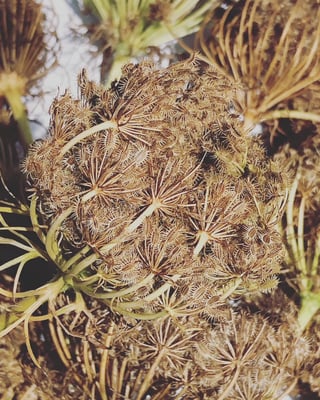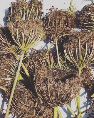 画像はニンジンの種を採る前の花房です。ニンジンのほかに小松菜、白菜、タアサイなども採種済み。今は夏野菜の種採りもしていて、完熟を待っているところです。
