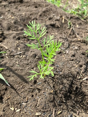 ニンジン栽培に大事なのは雑草除去。小さなニンジンを大きく育てるため、根気強く手作業で雑草を取っています。この時期にニンジンの生育がうまくいくと、秋から来年の春までの食卓でニンジンに困ることがなくなります。