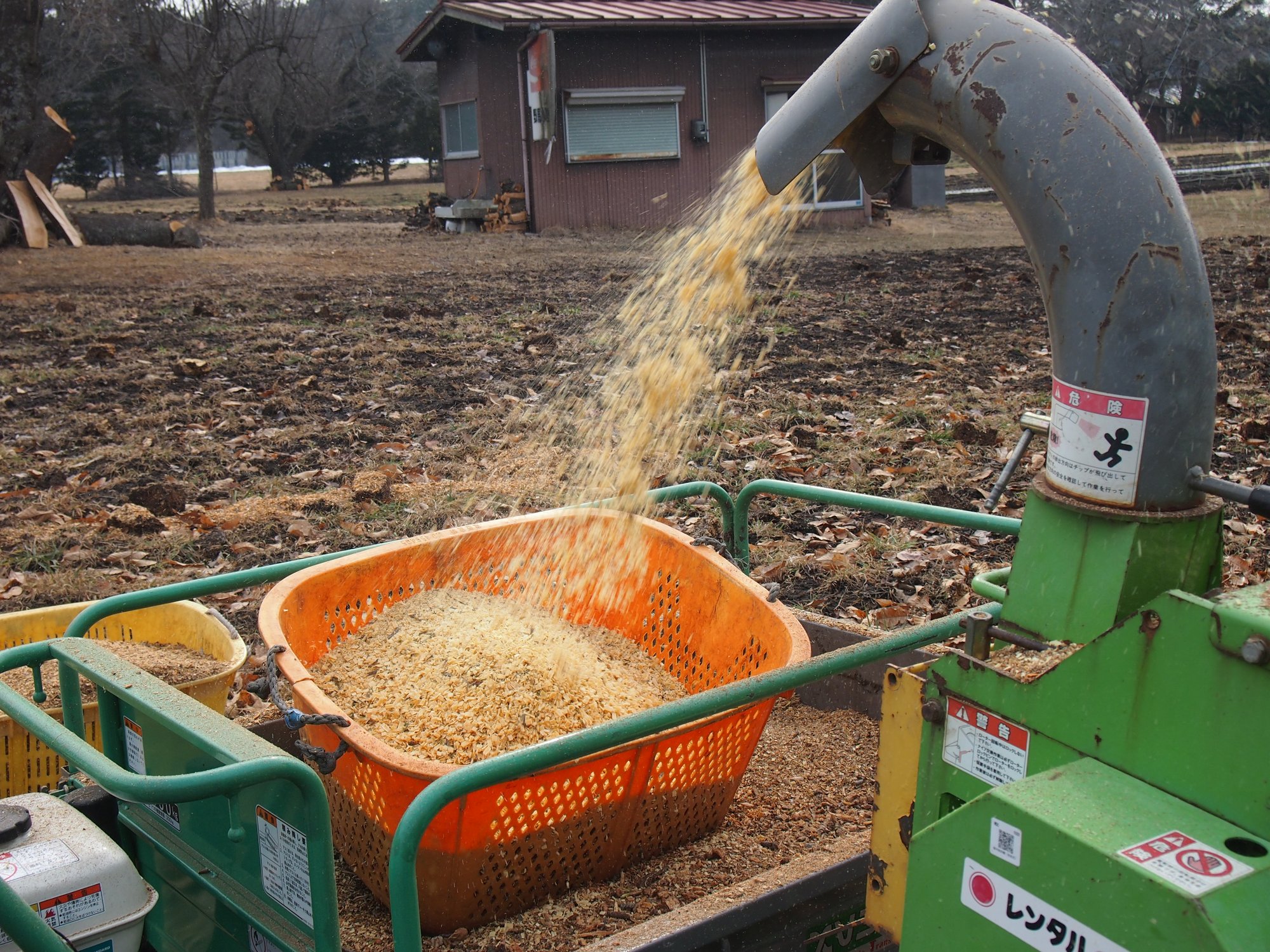 畑周りの年をとった桜の木を切ったり枝払いの作業をしていましたが、最後に木材粉砕機(チッパー)にかけてチップにしました。