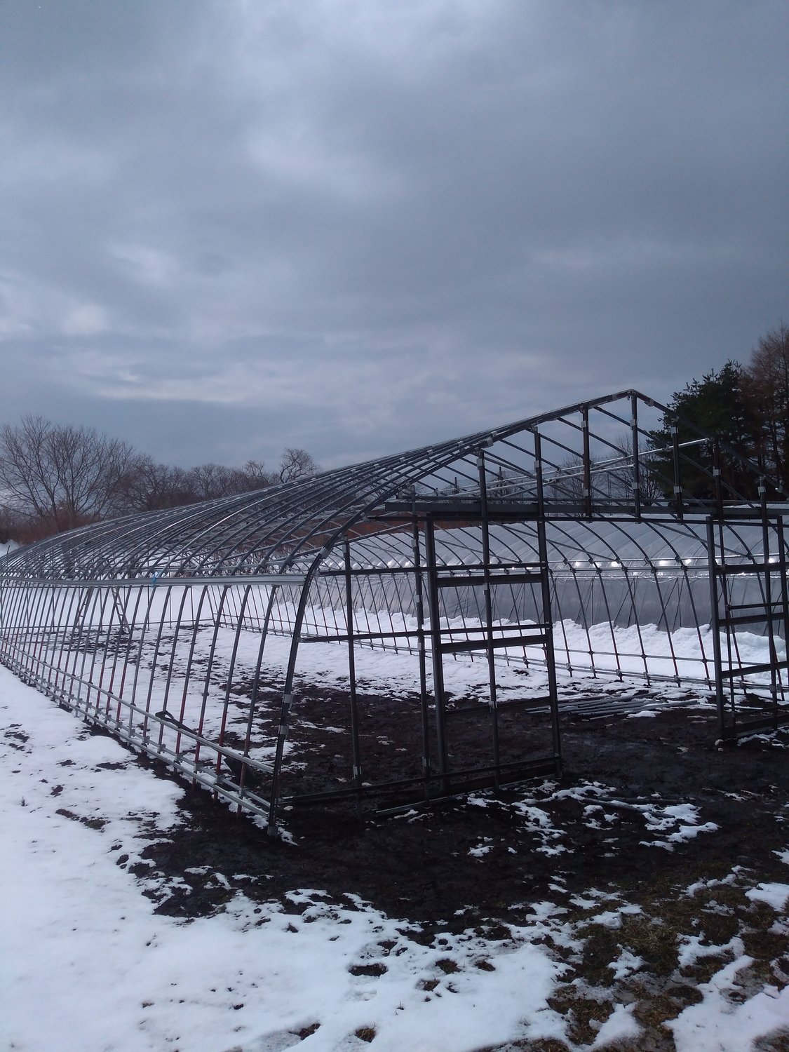 まだ雪が降っている八戸です。ビニールハウス2棟目、骨組みが完成しました!