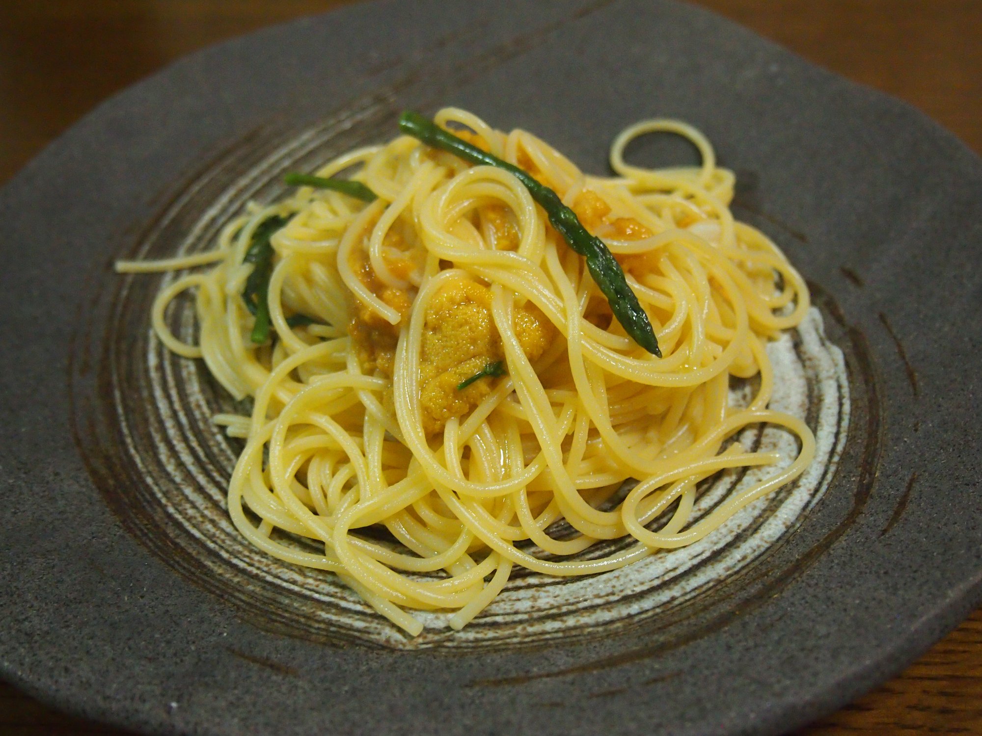 アスパラガスは旬を迎えて収穫も最盛期。同じくこれから旬を迎えるもの、それは生ウニです!おいしいですよね。パスタでアスパラとともに生ウニを堪能です。