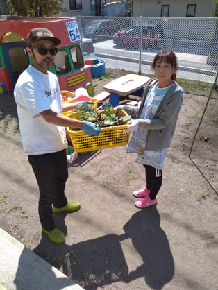 ご近所の保育園さんに、トマト苗とナス苗のプレゼント。子供たちがみんな「大きくなぁれ!」と一生懸命植え付けをしていました。