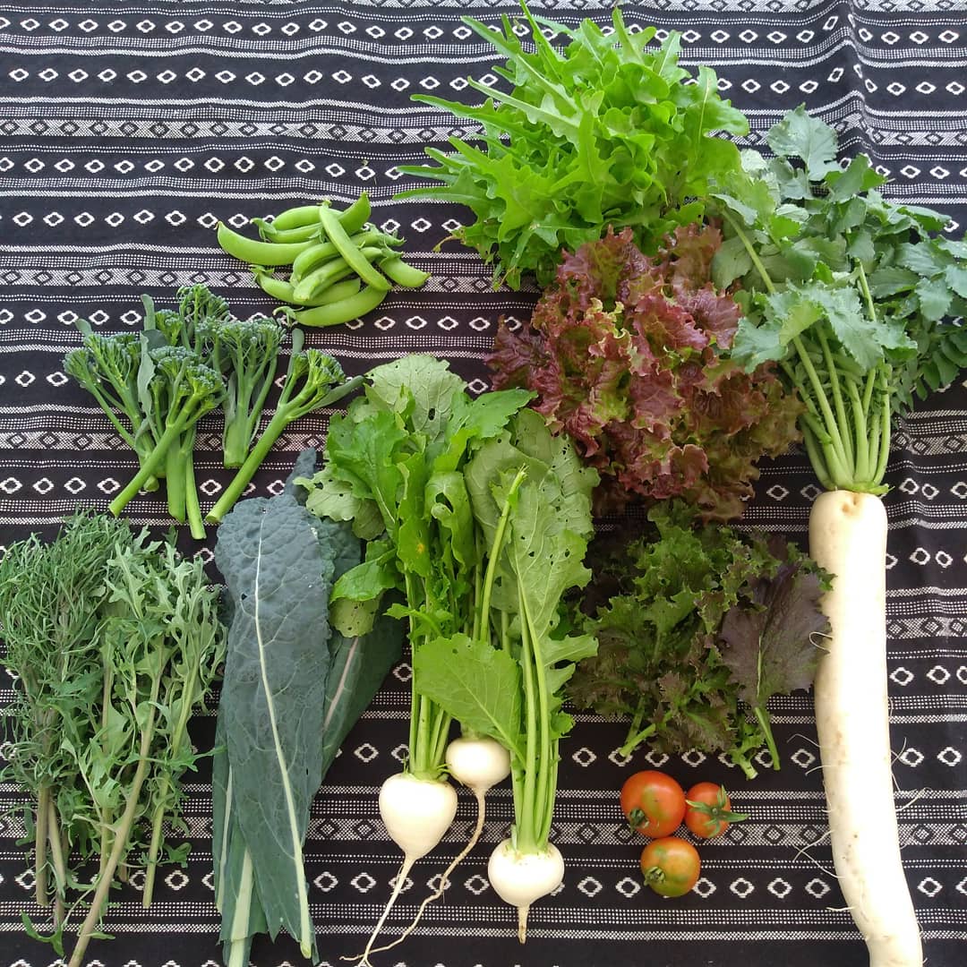 ソイルラボの野菜セット。赤くなりたてのトマトも添えて。夏野菜が少しづつ大きくなっています。