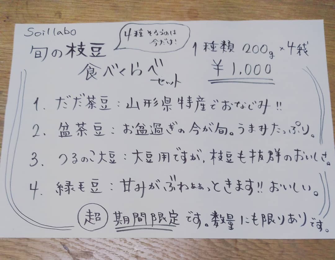 お久しぶりの投稿になってしまいました(^^; 毎日暑いのに、暑いとも言ってられないくらいやることいっぱい!やりきれず、雑草はどんどん伸び、途方に暮れ、それでも枝豆は立派に育ってくれました!!うれしい悲鳴を楽しいセットにしました。枝豆4種類を食べ比べ、いかがでしょうか?超!期間限定です。